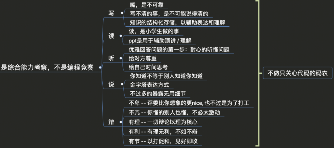 你的 Leader 一定告诉过你只会写代码是不够的。踏踏实实干活,两耳不闻码外事,这是开发同学的一大优良传统,但也是一大竞争劣势。不少开发同学,日撸代码万行,却羞于/不屑于/不擅长于除代码以外的事,因此而错失诸多良机,比如眼看某同学借助自己的劳动成果而成功打造他的个人影响力, 比如某同学因为勤于总结汇报而轻松盖过了作为主程的你…教训很多,唯有自强。记住:不做只关心代码的码农,因为你正在争取的是高级工程师。对于答辩,正是咱工程师综合能力(听/说/读/写/辩)集中展现的时候,具体如下图:
